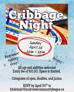 26BCL's Cribbage NightBCL's Cribbage NightTime: 2:00 pm - 6:00 pm Cribbage Tournament (All Ages)Sunday, April 26 | 2:00 PM – 6:00 PM Join us for a fun afternoon of cribbage! Beginner tables are free, and prizes are available. Cost: $10 per participant (via e-transfer) RSVP to: kfodchuk@brookviewcommunityleague.ca