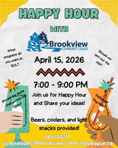 Contact: mensshedridge@gmail.com Website: Men's Shed 2111 Haddow Drive NW Edmonton, AB Map | 14 | 15Happy Hour with Brookview Community League (BCL members only)Happy Hour with Brookview Community League (BCL members only)Time: 7:00 pm - 9:00 pm Happy Hour with BCL (18+)Wednesday, April 15 | 7:00 PM – 9:00 PM Join us for refreshments, light snacks, and a chance to share ideas on how to build our community. Please RSVP to: vicepresident@brookviewcommunityleague.ca