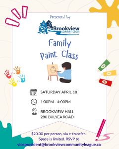 Family Paint ClassSaturday, April 18 | 1:00 PM – 4:00 PM All ages are welcome for an afternoon of creativity and fun! Cost: $20 per participant (via e-transfer) Spots are limited—please RSVP to: vicepresident@brookviewcommunityleague.ca Brookview Hall 280 Bulyea Road NW Edmonton, AB Map | ||||||||||||||||||||